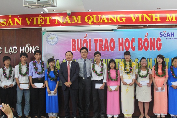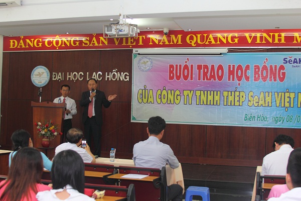 The  scholarship awarding ceremony was organized at Room B 203 – Campus 1 – Lac Hong University with the attendance of the Chief of the Dong Nai province’s Department of Education and Training Phan Dinh Chuong, Vice rectors of Lac Hong University Dr. Diep Cam Thu, Dr. Nguyen Van Nam and Lam Thanh Hien, M.A, Director of Enterprise Relations and Student Support center Tran Dung, M.A, General Manager of SeAH Steel Vina Corp.   Nam Hyung Kun and Deputy General Manager Park Sang Yong.