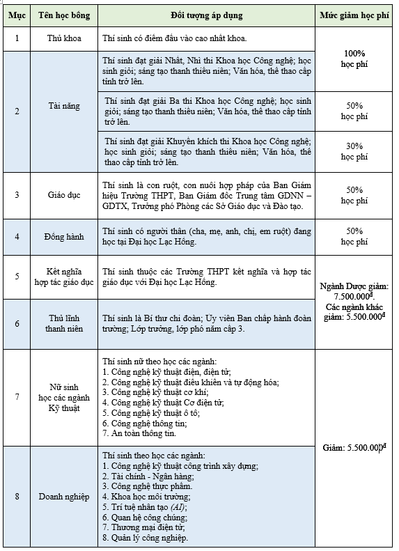 Trường Đại học Lạc Hồng luôn đồng cảm và thấu hiểu với hoàn cảnh của sinh viên, Nhà trường có nhiều chế độ chính sách dành cho sinh viên như: Học bổng thủ khoa; học bổng khoa học công nghệ; học bổng nữ sinh theo học các khối ngành kỹ thuật; học bổng cán sự lớp; học bổng doanh nghiệp; học bổng ưu tiên theo khu vực; học bổng dành cho 2 anh/chị/em ruột cùng học Lạc Hồng,…